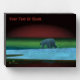 A polar bear roams the ice during the long polar night; the Northern Lights in red and green glow in the distance. Add your own text.