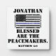 The thin blue line flag for the support of police officers with the Bible verse from Matthew 5:9 "Blessed are the peacemakers", a customizable name.