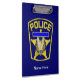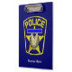 This custom dark blue clipboard is decorated with a police badge and can be customized with a name.