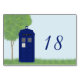 Quirky and fun Police Box Wedding Table Number Card featuring a brilliant blue vintage police box in a pretty field with a tree in the background. Easy to customize, simply add the text of your choosing in the text fields provided. Click "Customize It" to find more personalization options.