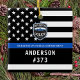 Thin Blue Line Police Department Christmas Ornament - American flag in Police Flag colors, modern black and blue design . Customize with your department logo, and personalize with police officers name and badge number. This personalized law enforcement ornament is perfect for police departments and law enforcement officers, stocking stuffers and christmas gifts to your police officers. Order these police ornaments bulk wholesale for the police academy or police department gifts, police christmas stocking stuffers. COPYRIGHT © 2020 Judy Burrows, Black Dog Art - All Rights Reserved. Police Department Custom Logo Blue Law Enforcement Ceramic Ornament