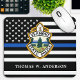 Thin Blue Line Police Department Mouse Pad - American flag in Police Flag colors, modern black and blue design . Customize with your department logo, and personalize with police officers name. This personalized law enforcement mousepad is perfect for police departments and law enforcement . COPYRIGHT © 2020 Judy Burrows, Black Dog Art - All Rights Reserved. Police Department Custom Logo Law Enforcement Mouse Pad