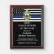 Celebrate and show your appreciation to an outstanding Police Officer with this Thin Blue Line Police Officer Of The Year Award - American flag design in Police Flag colors , modern black blue design with custom police department logo. Personalize this police officer award with officers name, text with law enforcement department name, logo and community, and date of issue. Perfect of police retirement awards, police service awards, and police recognition and appreciation. COPYRIGHT © 2020 Judy Burrows, Black Dog Art - All Rights Reserved. Police Department Custom Logo Officer Of The Year Award Plaque