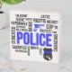 This wood box has the word Police in blue along with multiple words that describe what a police officer is and does. These would be great for a police retirement party or a party for someone who graduated from the police academy or any police activity.