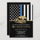 This design features a police force flag with black and white stripes, and a thin blue line stripe as well. The police badge and gold text sits above all of the party details for the retiring law enforcement officer, sheriff, captain, or chiefs retirement party details.