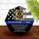 Personalized police officer of the year award, featuring the classic thin blue line police flag, and a gold badge and gold laurel wreath.