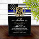 Personalized police officer of the year award, featuring the classic thin blue line police flag, and a gold badge and gold laurel wreath.