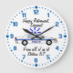 It says, "Happy Retirement, Sergeant. From all of us at Station 57." Add your own words instead of the sample name and information in the template to personalize. The clock has blue numbers and dots for minutes. You can delete those if you want.