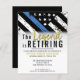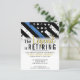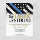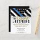This design features a police force flag with black and white stripes, and a thin blue line stripe as well. "The Legend is Retiring" text in gold sits above all of the party details for the retiring law enforcement officer, sheriff, captain, or chiefs retirement party details.