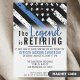 This design features a police force flag with black and white stripes, and a thin blue line stripe as well. "The Legend is Retiring" text sits above all of the party details for the retiring law enforcement officer, sheriff, captain, or chiefs retirement party details.