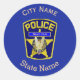 This custom round sticker is decorated with a Police Shield and can be customized above with the name of a town or city, the State name, and an Police Officer's name,or any other information you would care to substitute.
