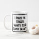 Funny slogan on a mug that says "I Police the Streets. what's YOUR super talent?". Mug for a Policeman, Police Officer or Police Force member. Black and white bold text.