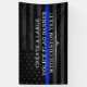 A large custom banner featuring a thin blue line police themed American flag.