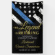 This design features a police force flag with black and white stripes, and a thin blue line stripe as well. "The Legend is Retiring" text sits above all of the party details for the retiring law enforcement officer, sheriff, captain, or chiefs retirement party details.