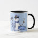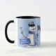 This holiday coffee mug for police officers features an artistically painted snowman wearing a police cap and holding a thin blue line American flag with stars and stripes and holding a sign that says "Merry Christmas". Designed by world renowned artist ©Tim Coffey.