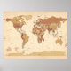 An political world map on a vintage style background. The map includes country names, capital cities, major cities, island names, sea names, latitude and longitude numbers, pacific island borders and two globe views.