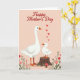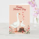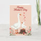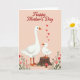This greeting card shows two white water birds against a soft blush-pink background, with a tall adult standing close beside a smaller, fluffy youngster perched on a rustic tree stump. The youngster leans in toward the adult’s face, creating a gentle, affectionate moment that reads like a caring bond between close companions ❤️. At the top, “Happy Mother’s Day” is placed in rich red lettering, and a small trail of red hearts floats nearby as if drifting down toward the pair. Both birds have bright orange beaks and webbed feet, adding warm contrast to their pale feathers and the rosy backdrop. Along the bottom edge, thin green stems rise with small red and pink blossoms, framing the scene like a quiet garden border 🌼. Near the base of the stump, a red-and-white spotted mushroom adds a cozy woodland detail beside the flowers. The lower foreground includes the stump’s textured wood grain, with the mushroom tucked slightly to one side among the stems and blooms.