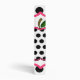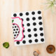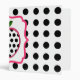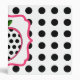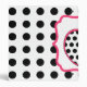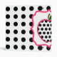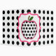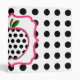 A binder with a black polka dot design on the front, back, and spine. Oversize pink bracket frame covers portions of front, back, and spine. Polka dot apple inside frame.