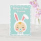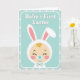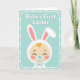 This card features a stylized baby centered in a bunny-eared bonnet, with closed peaceful eyes, rosy cheeks, and a small curl of golden hair peeking out, giving the scene a tender, affectionate feel 🐰. The tall ears rise above the head with soft pink inner panels and a scalloped trim that looks plush and gently textured. A tiny teal pacifier rests at the baby’s mouth, and a small bow tie below echoes the light aqua tones for a sweet, friendly touch. The background is pale teal with evenly spaced white polka dots, like a soft spring backdrop 🌷. A rounded-corner frame outlines the main illustration, keeping everything neatly contained. At the top, the phrase “Baby’s First Easter” sits above the character in white lettering with a subtle shadow, standing out clearly against the teal. The palette stays in soft blues, pinks, and creamy neutrals, and the baby’s bunny bonnet shows tall ears with pink interiors and scalloped edging.