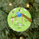 A bright green background with white polka dots accents this sweet whimsical birdie sitting on a tree branch. Customize by adding babies name and birth date as desired.