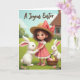 This design shows a young girl with big brown eyes and thick curly hair standing in a sunny green meadow, her cheeks lightly pink as she smiles toward her two fluffy white rabbits 🐰. She wears a pink smock dress with scalloped lace trim and a wide straw hat topped with a coral bow, and her hand reaches down as if inviting a gentle hello. One rabbit lifts a paw to meet her fingers, and their close, tender pose reads like quiet friendship. The second rabbit stays near a rustic woven basket filled with pastel eggs in soft shades, each dotted with tiny polka marks. Behind them, a small cottage with a gabled roof sits in the middle distance, with teal window accents and a warm terracotta roof under a blue sky with thin clouds 🌷. The greeting text sits near the top in a light, springlike color, with a smaller line placed nearer the bottom in a softer shade. Pink and white little flowers peek through the grass in the foreground around their feet and the basket.