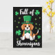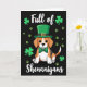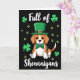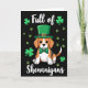 This card shows a stylized Beagle centered on a deep, inky black background, dressed up for St. Patrick’s Day with a bright emerald leprechaun hat and a shiny gold buckle. A green polka-dot bow tie sits neatly at its neck, giving the pup a dressed-for-company look that feels like it’s ready to charm a close friend 💚. The Beagle’s big, dark eyes look straight ahead with a gentle, inviting gaze, like it’s sharing a quiet joke with someone it trusts. Its tri-color fur—tan, white, and small black patches—stands out clearly against the dark backdrop while the green accents add a festive wink ☘️. Around the dog, small green shamrocks and matching paw prints float like confetti, filling the space without crowding the center. Near the top, the words “Full of” appear in white, and near the bottom, “Shenanigans” is also written in white, balancing the layout above and below the pup. The hat tilts slightly to one side, and the scattered shamrocks and paw prints drift across the black field in the same green as the bow tie.