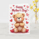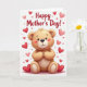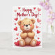 This card shows a soft digital illustration of a light brown teddy bear sitting calmly on a white background, with big shiny eyes and a small smile that feels like a quiet, affectionate glance ❤️. A gentle pink blush on its cheeks and the way its paws are clasped together give it a shy, caring posture, like it’s offering a sweet thank-you. Across the top, a short greeting is placed in large deep-red lettering, standing out clearly against the white space. Around the bear, small hearts in dark red and rosy pink drift in a loose scatter, adding a romantic, friendly warmth to the scene. A few hearts float closer to the bear’s body, making it look surrounded by affection rather than alone. The lighting is soft and slightly shaded, giving the bear a cozy, plush look without harsh edges. Near the bottom, two matching hearts sit close to its feet, with a tiny 🌼 tucked nearby.
