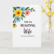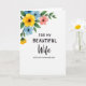 Designed with a soft watercolor look, the card features a clustered spray of flowers and leafy stems gathered in the upper-left area, leaning inward as if offering a gentle embrace ❤️. Sunny yellow, sky blue, and coral-pink petals blend with fresh green leaves, and each bloom has a darker center that adds contrast. The rest of the front stays mostly white, giving the artwork room to breathe and keeping the focus calm and intimate. Centered below the flowers, the top line of text reads “FOR MY BEAUTIFUL” in a neat, easy-to-read sans-serif style in a dark tone. Just beneath it, “Wife” appears larger in flowing cursive lettering, adding a romantic, tender emphasis without needing extra decoration 🌼. A final line below reads “WITH LOVE ON MOTHER’S DAY” in the same simple sans-serif style, aligned to the center. The floral cluster sits high and left, with the message stacked in the middle-lower portion against a wide white background.