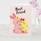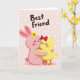 This card shows two cute animal friends cuddled close, with a long-eared bunny in soft pink holding a small yellow bird against its chest 🐰. A tiny yellow flower sits above the bunny’s ear, while the bird wears a bright red bow that adds a sweet, affectionate touch. Their eyes are gently closed, and light rosy cheek marks make the hug look tender and trusting, like a quiet moment between close friends. The background is a pale pink field with small white polka dots scattered evenly, giving the scene a soft, cozy setting. Near the top, the words “Best Friend” appear in a casual, hand-drawn style, set in a darker pink tone that stands out without feeling sharp. The text is centered above the characters, leaving plenty of open space so the embrace remains the main focus 🌷. The bunny sits in the lower middle of the design, arms curved around the bird, with the red bow and yellow flower as the brightest accents.