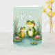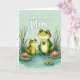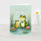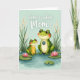 This card shows two friendly, human-like amphibians standing close together in a quiet pond scene, their rosy cheeks and soft smiles suggesting an affectionate bond ❤️. The larger green character faces forward with a wide, grateful grin, wearing a round badge on its chest that reads “best mom.” Next to it, a smaller companion in a yellow smock with white polka dots tilts its head up with an admiring look, as if sharing a sweet, trusting moment. The water around them is shaded in gentle blue-green tones with light ripples, giving the setting a calm, cozy feel. Across the top, the phrase “home is where Mom is” appears in white lettering, centered above the characters against the airy background. Tall green reeds and pale, feathery grasses frame the upper area, while tiny white and pink blossoms float behind them like soft confetti 🌼. Bright green lily pads spread across the lower half, and a few pink water flowers sit on the surface near the characters.