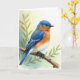 This design shows a small bird in rich blue and warm orange perched on a sturdy branch, like it’s pausing for a quiet moment with someone nearby ❤️. Its head is a deep sky-blue, its chest glows orange, and the color fades into a soft white belly with feathery texture that looks gently fluffed. The wings are layered with lighter blue tones and thin white accents that feel like careful brush strokes. A dark eye with a faint reddish ring looks off to the right, giving the bird an attentive, almost affectionate focus, as if watching a close friend approach. The black feet curl around the rough brown bark, adding a grounded, calm touch to the scene. Behind it, the setting is a soft wash of pale yellow and muted green, with blurry hints of leaves that keep the mood tender and calm 🌼. There’s no text on the front, leaving the bird centered against the airy background while the branch angles across the lower portion of the artwork. The background fades from warm yellow near the top into gentle green tones with faint, misty foliage shapes.
