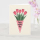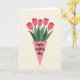 Designed with a simple romantic touch, this digital illustration features a bouquet of five tulip-like flowers in warm pink tones, their layered petals leaning close as if sharing a quiet moment ❤️. The blooms rise from a light pink, cone-shaped wrapper that sits at the lower center, gently holding the stems like a caring embrace. Deep green leaves weave between the flowers, adding contrast and a fresh, lively rhythm to the arrangement. The background is a smooth cream color, leaving plenty of open space so the bouquet feels like the main focus of a thoughtful gesture. Near the bottom, tucked within the wrapper area, a short greeting appears in dark pink cursive-style lettering, centered and easy to spot. The overall look is soft and modern, with the flowers arranged evenly as if set out for a close friend or loved one 🌼. The stems and leaves gather neatly above the text, and the wrapper’s pointed tip angles downward at the very bottom of the card.