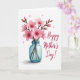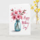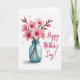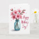 This greeting card features a glowing bouquet of soft pink blossoms arranged in a clear, aqua-tinted glass jar, set against a bright white background. The petals shift from pale rose to deeper fuchsia, with tiny golden centers and a few shy buds tucked between open blooms, hinting at a sweet, affectionate moment ❤️. Light reflections on the jar and a gentle shadow beneath it give the arrangement a calm, intimate presence, like flowers left for someone special. On the right side, a flowing message appears in rich pink lettering, placed mid-height so it balances the bouquet without crowding it. Above, faint pink circles are scattered lightly across the top area, like soft dabs of watercolor drifting through the air 🌼. Fine details show in the petal veins and the glass highlights, adding a tender, close-up feel as if you’re standing right beside the jar. The aqua glass catches pale light along its rim and curves, while the pink blooms fan outward with a few petals pointing toward the text.