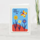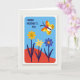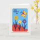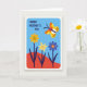The front design shows a sky-blue background filling most of the card, framed by a white border, with rounded terracotta-red hills along the bottom. Three tall flowers rise from the hills on deep indigo stems, their slim leaves leaning in toward each other like close friends sharing a quiet moment ❤️. Two blossoms are marigold yellow with small dark dots at their centers, while the third is a deep royal blue flower with a bright orange center that draws the eye. Near the upper right, a small winged insect drifts through the open space, its yellow-and-orange wings decorated with tiny spots and circles, adding a gentle, affectionate energy. The colors are flat and simple, giving the scene a tidy, graphic look that feels sunny and calm 🌼. In the upper left, the words “Happy Mother’s Day” sit clearly in dark sans-serif lettering against the blue. The insect has dark antennae, and the white border stays even on all sides.