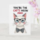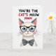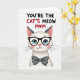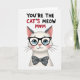 This card features a stylized white cat centered on a bright white background, gazing forward with big sky-blue eyes behind thick black glasses that give it a sweet, attentive look ❤️. Soft pink blush warms its cheeks and nose, like it’s leaning in with friendly affection. Just below the face sits a charcoal-gray bow tie dotted with small white polka dots, adding a tidy, dressy touch. Across the top, the message “YOU’RE THE CAT’S MEOW MOM” is set in uppercase letters, spaced to feel airy and easy to read. Most of the text appears in dark lettering, while “CAT’S MEOW” stands out in red to draw the eye. In “MOM,” the “O” is replaced with a red heart, adding a gentle romantic note without needing extra decoration 🌼. The cat’s fur is hinted at with light texture rather than heavy detail, keeping the focus on its tender expression. The layout stays minimal, with the cat centered and the headline sitting above it, leaving plenty of white space around both.