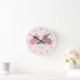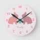 Personalized wall clock with pink and purple polka dot bunnies on pastel pink background with a green heart in-between.