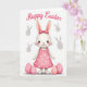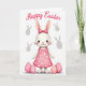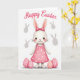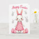 This card shows a white bunny standing front and center, with glossy black eyes, a small smile, and rosy cheeks that give it a sweet, friendly look 🐰. Long upright ears frame a bright pink bow, and the bunny wears a light pink dress sprinkled with small white dots, like it’s dressed up for a gentle spring outing 🌷. Near the bottom, several decorated eggs in pink and coral sit close together, as if gathered around the bunny like cheerful companions. The background stays mostly white, with soft, misty gray bunny shapes along the edges that feel like quiet onlookers in the distance. The lighting looks like a soft watercolor wash, smoothing the colors and making the scene feel tender and close. A seasonal greeting appears near the top in a lively pink, with the letters flowing across the open space without crowding the artwork. The bright pink bow matches the dress, and the eggs below repeat the same warm pink tones against the pale background. Faint gray rabbit silhouettes hover around the outer border while the pink-and-coral eggs cluster along the lower edge beneath the bunny.
