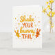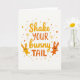 This design shows a bright white background with the phrase “Shake YOUR bunny TAIL” centered large, with “Shake” and “bunny” in a flowing, hand-drawn look and “YOUR” and “TAIL” in tall capital letters. The lettering shifts through warm orange to sunny yellow, edged with a thin white outline that makes the words stand out. On the left, a long-eared bunny in yellow-orange kicks outward as if dancing toward the message, while on the right a deeper orange bunny mirrors the move, angled back toward its partner with a friendly, teasing grin 🐰. Their simple faces include wide smiles, lively eyes, and tiny fangs that make the pair look like they’re sharing a goofy inside joke. Around them, scattered orange and yellow polka dots float like confetti, adding motion and a party feel. Small sunburst icons are sprinkled between the dots, giving the layout a warm spring glow 🌷. The two bunnies flank the text evenly, with dots and sunbursts filling the open space across the white field.