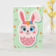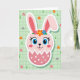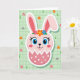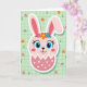 This card features a cute bunny-like character 🐰 centered on the front, shown rising from a cracked eggshell base decorated with small white polka dots. The character is drawn in soft pink and white, with big bright blue eyes, rosy cheek marks, and a tiny upturned smile that feels like it’s meant for a close friend. A ring of small flowers crowns its head, mixing pink, orange, and blue blooms that suggest someone thoughtfully picked them for a special person. Behind the character sits a muted mint-green background with a faint grid texture, dotted with tiny flowers, tufts of grass, and soft cloud shapes 🌷. A white border frames the scene, and a gentle shadow gives the central figure a slight lift from the background. There’s no text on the front, so the illustration takes full focus and leaves room for your own words inside. The mint-green grid backdrop is sprinkled with miniature blossoms and pale cloud silhouettes around the border.