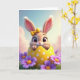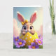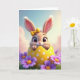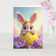 This card features a vertical scene with a wide-eyed bunny 🐰 peeking out from a cracked yellow egg shell dotted with small white circles. The bunny’s soft fur, long upright ears, tiny pink nose, and fine whiskers are drawn with gentle detail, and a small yellow bow sits between its ears like a sweet little accessory. The pose feels friendly and a bit flirty, as if the bunny is leaning forward to greet someone special. Behind it, the background fades from pale blue into soft pink with light, airy cloud shapes that suggest a calm spring morning. Along the bottom edge, green grass frames the scene, sprinkled with purple and fuchsia flowers 🌷 that add a cozy, welcoming touch. Each flower has a warm orange center, creating a bright contrast against the cooler petals and the sunny shell. Near the top, a short Easter greeting is placed in rounded lettering, set in a medium pink color that stands out against the pastel sky. The cracked shell shows jagged edges and glossy highlights, with white dots scattered across the curved yellow surface.
