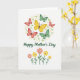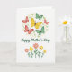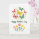This greeting card features a bright digital illustration on a white background, with a gentle, airy garden scene that feels like a warm hug ❤️. Near the top, a loose circle of winged insects floats in place, led by several large butterflies in sunny yellow, calm teal, and warm coral that seem to drift toward one another like close friends. Smaller pale-green insects and tiny cream blossoms are sprinkled around them, adding a light, affectionate flutter to the space. Centered below the flying cluster, a Mother’s Day message is placed in flowing green lettering, standing out clearly against the white. Along the bottom edge, a grounded row of stylized flowers rises in different heights, mixing blush pink and soft yellow petals with green stems and leaves 🌼. The overall layout keeps lots of open white space, letting the colors breathe and giving the butterflies room to “dance” above the words. The lower floral cluster includes simple rounded blooms and a few leaf shapes that angle outward from the stems.