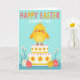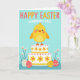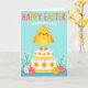 This card features a plump yellow chick with rosy cheeks and a gentle, friendly gaze, set against a soft blue background that feels like a calm spring morning 🌷. The chick sits atop a two-tier cake-like stand in pale yellow, decorated with small flower shapes and a red polka-dot trim that adds a sweet, party look. Near the top of the design, a short headline is placed in small lettering, colored in a darker shade for contrast against the blue. Below the stand, several decorated egg shapes in mixed patterns cluster together, as if gathered close like friends. They rest among stylized green leaves with tiny white and orange blossoms, suggesting a shared garden spot where everything feels close and cared for 🐰. The flat, graphic style keeps the shapes simple and easy to read, while the warm yellows and soft reds stand out clearly against the cool background. At the bottom edge, the foliage forms a loose border, with eggs tucked between leaves and blossoms.