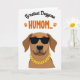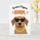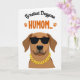 Designed with a modern graphic look, this card features an upright, medium-brown canine character centered on a bright white background, giving it lots of open space to stand out. The character wears dark rectangular sunglasses and holds a slightly tilted, knowing smile that reads like a friendly wink ❤️. A thick, gold-toned chain hangs around its neck, adding a humorous touch that feels like it’s dressed up to impress someone it adores. Near the top, the phrase “Greatest Doggone” is placed above the character in flowing black lettering. Directly below that, “HUMOM” appears in large orange letters, with small orange paw-print icons on either side for a sweet, affectionate nod 🌼. The limited palette—warm brown, black, orange, and gold—keeps the design focused while still feeling lively and cozy. The sunglasses are a deep charcoal black with crisp edges, and the chain is drawn with shiny highlights that suggest polished metal.