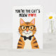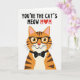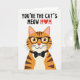 This card features a friendly, human-like ginger tabby cat centered low on a bright white background, looking straight out with a gentle, affectionate smile ❤️. The cat’s warm orange fur is shaded with darker brown stripes, and its lighter cream muzzle and chest soften the look, like it’s leaning in for a cozy hello. Big amber eyes shine behind thick black-rimmed glasses, adding a smart, sweet charm that feels like a fond inside joke between close family. A neat black bow tie with small white dots sits at the neck, giving the character a dressed-up, caring-for-you feel. Near the top, dark uppercase lettering reads “YOU’RE THE CAT’S MEOW M❤️M,” with a red heart replacing one character in the last word. The text is spaced across the upper area so it sits above the cat’s head, leaving plenty of open space that keeps the focus on the face and message 🌼. The overall look is crisp and simple, with the cat anchored at the bottom and the dark text and red heart standing out sharply against the white. The cat’s glasses, bow tie, and bright eyes are drawn with smooth, clear outlines, and the heart symbol is a solid red accent in the top line of text.