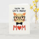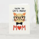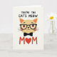 This card features a stylized tan cat centered on a soft off-white background, with peach-toned inner ears and rosy cheeks that give it a gently affectionate look ❤️. The cat’s small upturned smile and bright orange eyes create a friendly, tender expression, like it’s gazing at someone it adores. Rounded black glasses with tiny white dots sit on its face, adding a cozy, companionable feel. Thin black whiskers extend outward, and a neat black bow tie rests just under the chin for a dressed-up touch. Across the top, the phrase “YOU’RE THE CAT’S MEOW” appears in thick, hand-drawn lettering in dark ink, arched slightly above the character. Near the bottom, “MOM” is set in bright red letters, with a heart symbol taking the place of the “O” 🌼. The heart is a solid red shape centered between the two red “M” letters.