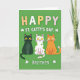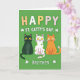 This greeting card shows three stylized cats lined up across an emerald green background, creating a festive St. Patrick’s Day scene with a friendly, affectionate feel 💚. On the left sits a deep forest-green cat with glowing yellow eyes, holding a calm, steady gaze as if keeping watch over its pals. In the middle, a white cat covered in lime-green polka dots leans into the fun, its bright look suggesting it’s the one starting the jokes. On the right, a warm orange tabby balances the trio with a relaxed expression that reads like an easygoing friend who’s happy to be included. Across the top, the word “HAPPY” stretches in large pastel letters—peach, white, goldenrod, and blush pink—with soft shadowing that makes each character stand out. Beneath the cats, “ST. CATTY’S DAY.” appears in crisp white, flanked by small shamrock shapes ☘️. At the bottom, “BROTHER” is set in white as well, with matching shamrock accents, all arranged on the flat green field with simple shapes and gentle layered shading.