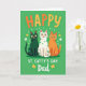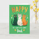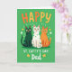 This card shows three stylized cats sitting front and center on an emerald-green background, close enough that their shoulders nearly touch like good friends posing for a photo 💚. The left cat is deep forest green with lighter teal polka dots, the middle cat is white with bright green spots, and the right cat is warm orange with slightly darker dots, creating a cozy trio. All three have wide yellow eyes and a tiny pink tongue peeking out, giving them an affectionate, teasing look toward the viewer. At the top, the word “HAPPY” sits above their heads in rounded letters shaded from orange into golden yellow. Under the cats, “ST. CATTY’S DAY” is written in white, and the word “Dad” appears nearby in a flowing cursive style. Small golden shamrocks and a few four-leaf clovers are scattered around the lower area, adding a lucky St. Patrick’s Day touch ☘️. Tiny white dash marks float around the cats like confetti, with clover shapes tucked between them and the text.
