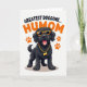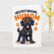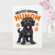 This greeting card features a fluffy black dog shown straight on, wearing bright orange sunglasses and flashing a wide grin with a pink tongue peeking out for a flirty, friendly feel ❤️. A gold-toned chain with a bone-shaped pendant hangs at its neck, adding a cheeky touch that reads like a fun gift from someone close. Above the dog’s head, a short line of text arches in strong black letters, like an upbeat headline. Below, a larger line of text sits near the bottom in a rich orange color, drawing the eye and reinforcing the warm, affectionate tone 🌼. Four orange paw prints appear around the dog in a balanced arrangement, like little hints of company and closeness. The background stays plain white so the black fur and orange accents stand out with sharp contrast. A soft gray shadow sits directly under the dog, giving the figure a grounded look without adding extra clutter. The orange paw prints are placed symmetrically, two on each side of the dog.
