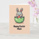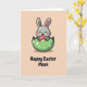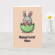 This card shows a spring scene with a cute, grey, long-eared bunny 🐰 popping up from the jagged edge of a cracked egg. Its eyes are gently closed with a wide smile and rosy cheeks, giving it the look of someone greeting a loved one with quiet affection. The bunny holds a smaller red egg close to its chest, dotted with tiny white spots like a sweet little gift. The larger broken shell is lime green with matching white dots, tying the colors together in a simple, cheerful way. Everything sits on a pale warm peach background that keeps the focus on the characters and shapes, with a soft shadow under the shell for a bit of depth. Near the bottom, the words “Happy Easter Mom” appear centered in rounded lettering, set in a darker tone that stands out clearly against the peach. A few crisp outlines define the bunny’s ears, the cracked shell edges, and the polka dots 🌷. The red egg’s white dots are evenly spaced, and the green shell’s crack line runs in a zigzag across the top rim.