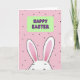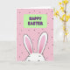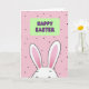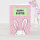This card features a sweet, stylized bunny peeking up from the bottom edge 🐰, as if shyly leaning in to share a quiet moment with someone special. Its long ears take up much of the lower area, outlined in black with soft pink inner sections that add a gentle blush-like touch. The bunny’s face is only partly shown, with relaxed closed eyes and a small smile that feels like a tender, affectionate glance. Centered above the bunny sits a rounded rectangle banner in pale green, creating a calm focal point. Inside the banner, a celebratory message appears in purple letters with a dark outline, placed neatly in the middle for easy reading. The background is bubblegum pink, sprinkled with small black dots that drift around like confetti 🌷. The overall look stays simple and graphic, with smooth shapes and balanced spacing that makes the bunny and banner feel close and connected. The bunny’s black-outlined ears rise into the pink field beneath the green banner, while scattered black dots fill the open space around them.